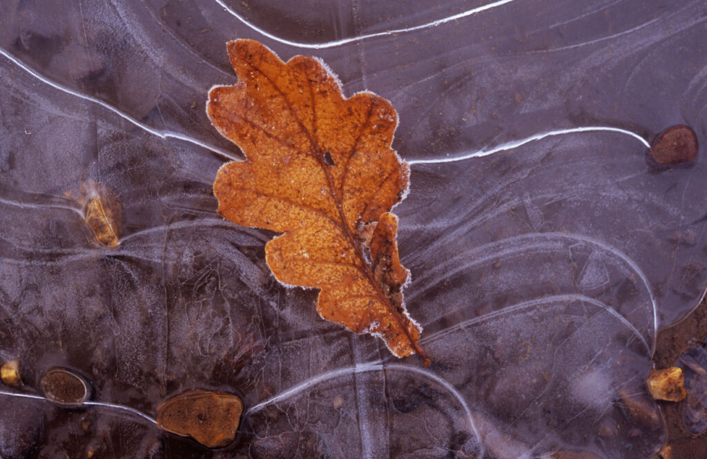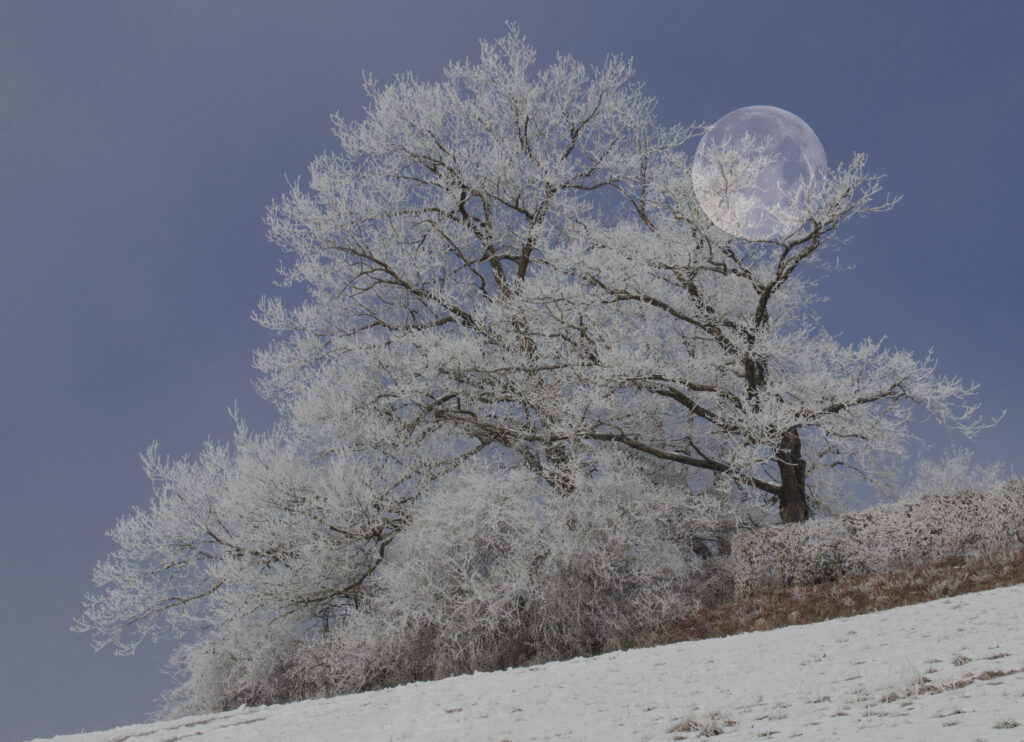 Only rarely do spectacular weather and lunar events come together to produce the most phenomenal of winter conditions. Clear, calm skies without a breath of wind combine with sub-zero temperatures to freeze water vapour in the air producing ice crystals on the cold surfaces of trees, plants and ground. The result is a hoar frost that brings to all it comes into contact with, a touch of breathtaking magic as the world is seen again in a new light. The landscape is brought to our attention suddenly, as if for the first time, when the taken for granted shapes of nature – leaves, grasses, berries and seed pods – are made shockingly beautiful overnight, and revealed dramatically by day: their forms and edges highlighted with feathered white crystals glistening in the winter sun.