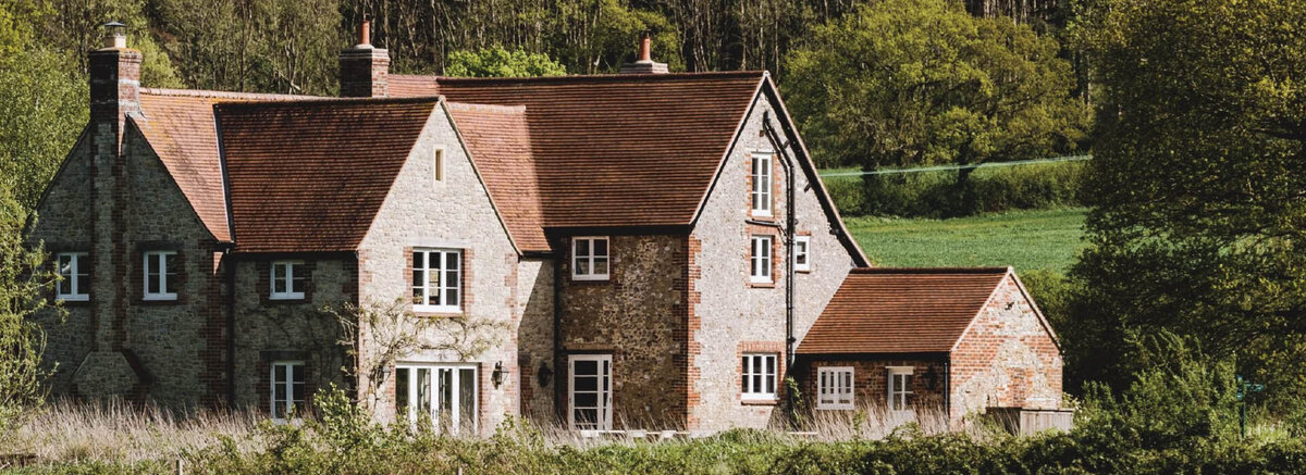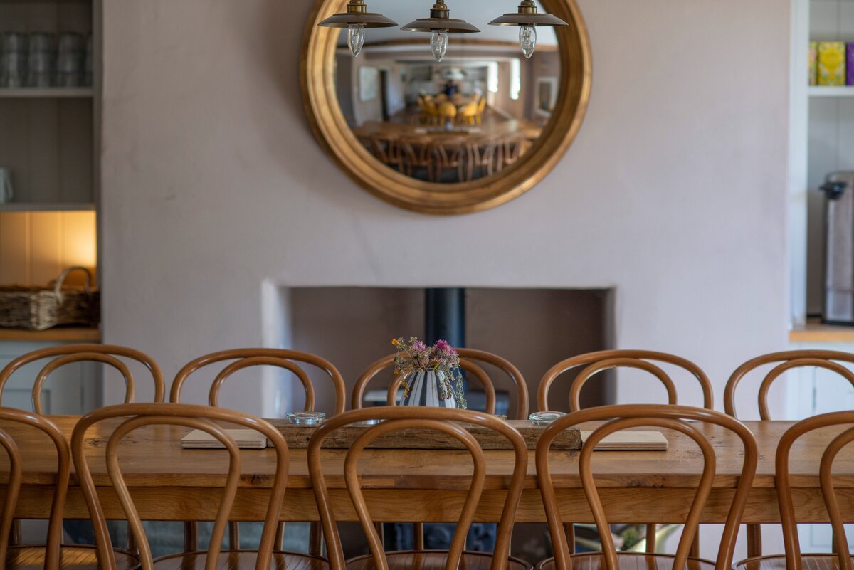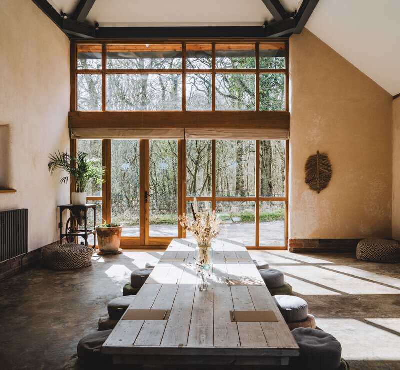 The main house and shared spaces are designed for gathering and stillness alike. The library and sitting rooms invite you to curl up with a blanket and a book, or simply rest by the wood-burning stove as the day fades. The dining hall, with its long wooden tables and views across the fields, becomes the heart of the retreat — a place for shared meals, conversation, and the soft hum of community.